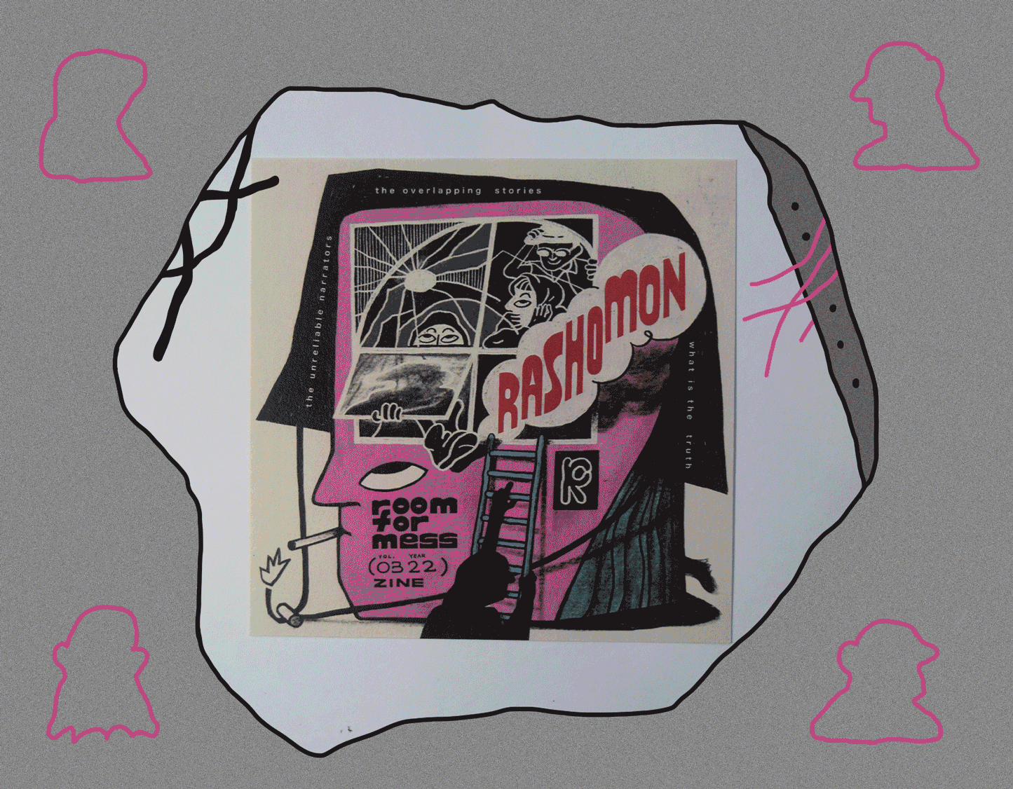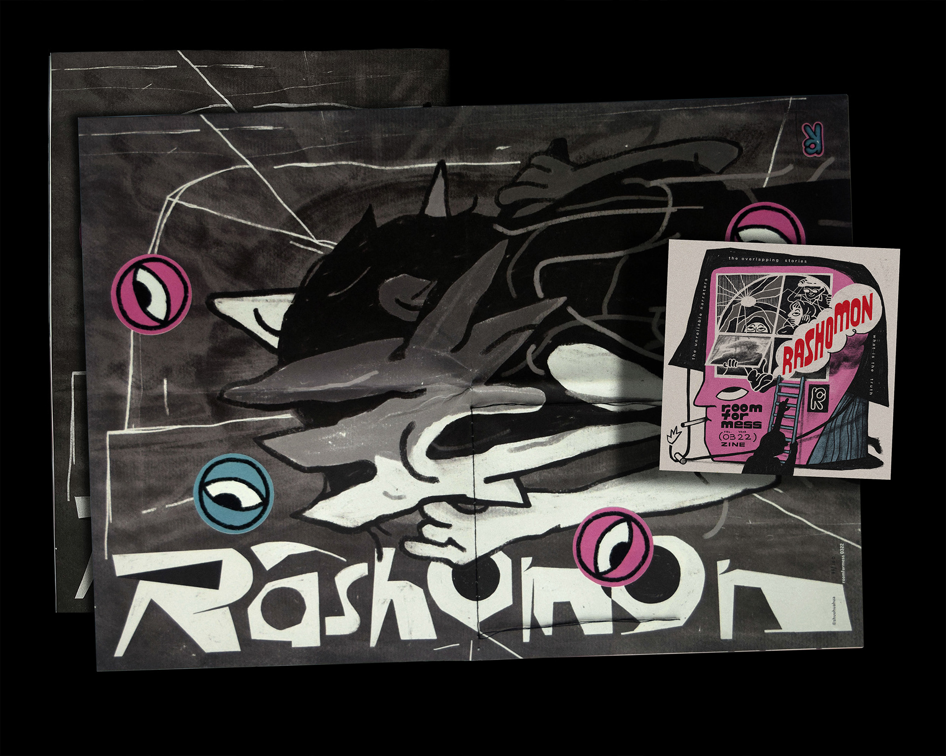 Rashomon is an experimental zine that invites readers to experience the story from their own perspective by flipping the zine and changing the scene. This non-linear storytelling zine begins with the search for the truth and ends with open interpretation by individuals.