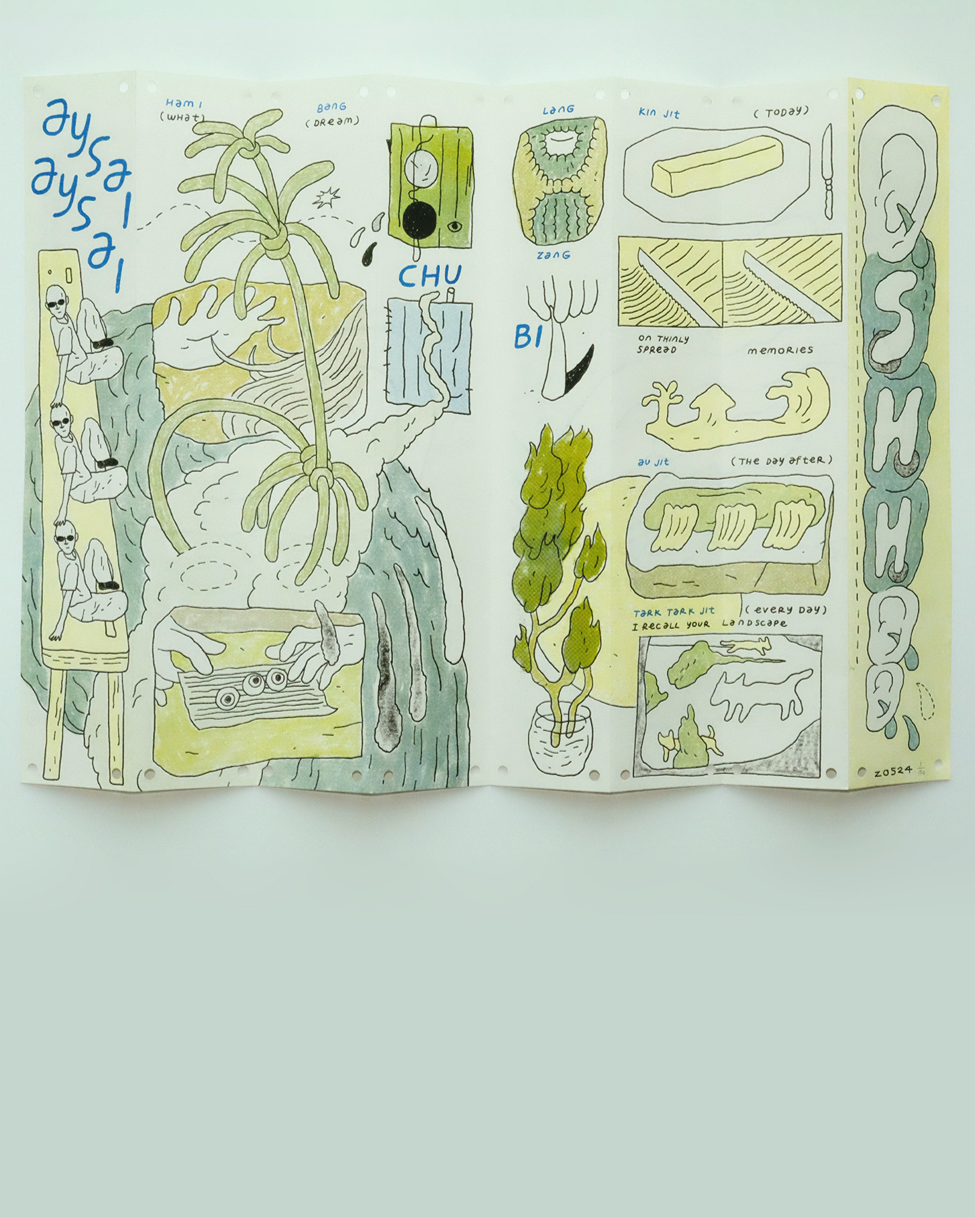 Printed entirely in Risograph on a single A2 sheet, the zine folds into an 8-panel "scene roll" format. Inspired by continuous-form paper and film rolls, it features signature punched holes along the edges.